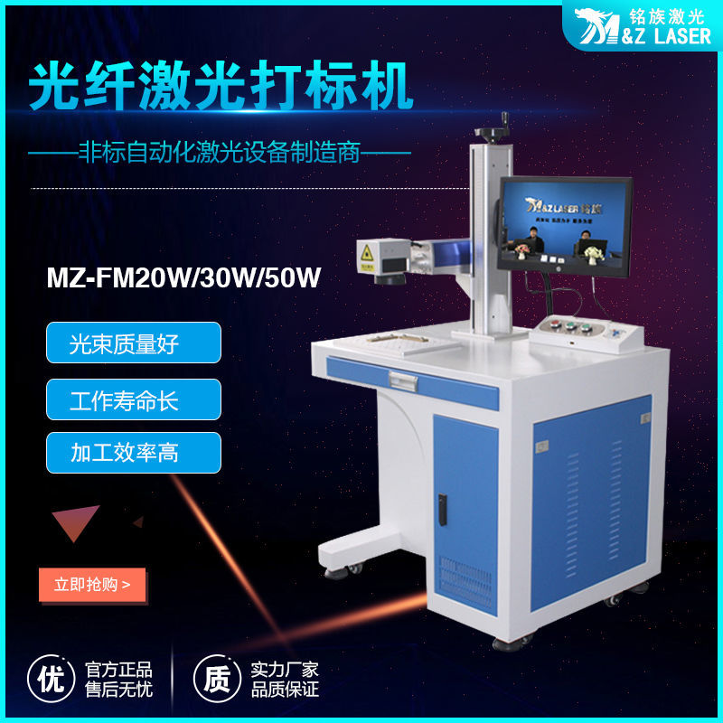 MZ-FM-20/30/50/100W-R光纖激光打標機是我公司運用現(xiàn)今世界上先進的激光技術(shù)研制而成的新一代激光打標機系統(tǒng)。采用武漢銳光纖輸出激光,再經(jīng)高速掃描振鏡系統(tǒng)實現(xiàn)打標功能。光纖激光打標機電光轉(zhuǎn)換效率高,達到30%以上,采用風(fēng)冷方式冷卻,整機體積小巧,輸出光束質(zhì)量好,可靠性高??傻窨探饘俨牧虾筒糠址墙饘俨牧?,主要應(yīng)用于對深度、光滑度、精細度要求較高的領(lǐng)域,如鐘表、首飾、模具行業(yè),位圖打標等。